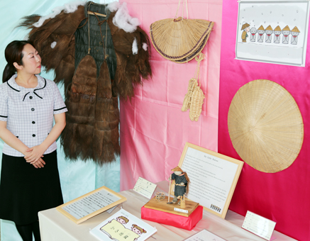 「かさ地蔵」「かちかち山」など、よく知られる10編のあらすじとともに、物語に登場する蓑、火打ち石、茶釜など約30点を昔話ごとに展示。道具の使い方の説明文も添えている。
