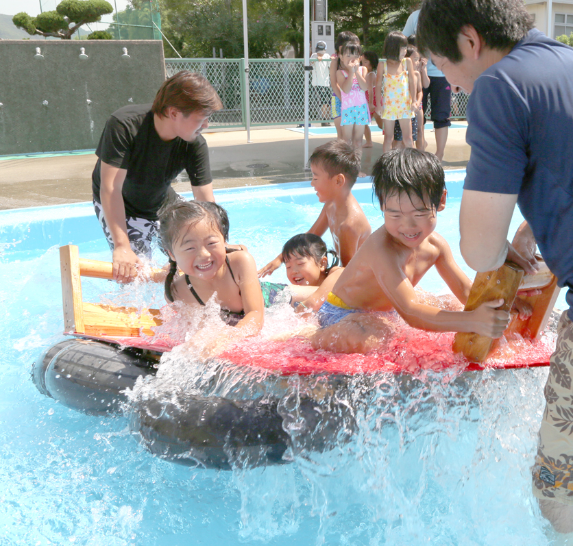 いかだは古タイヤと木材などの手作り。子どもたちが4〜5人乗った状態で保護者2人がサブンザブンと上下に揺らすと波しぶきの大きさに比例して歓声が上がった。ウオータースライダーは高さ約2メートルのすべり台から水を張ったビニールプールへ滑り降り、スリルを楽しんだ。