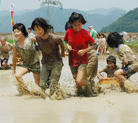 水に浮かべた発泡スチロールの上を走る島渡りや二人三脚など7種目を実施。泥そりレースではバランスを崩して泥の中へ放り出されたり、息が合わず足がもつれて倒れこんだりする子もいた。