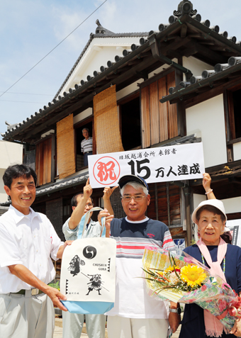 15万人目となった三木市宿原の大山陽(あきら)さん(77)は妻の三世子さん(77)と赤穂を一泊旅行した2日目に初来館。部材の7割は天保年間のものという建物を目にし、「梁一つを見ても年代を感じました。友だちにも紹介したい」と話していた。