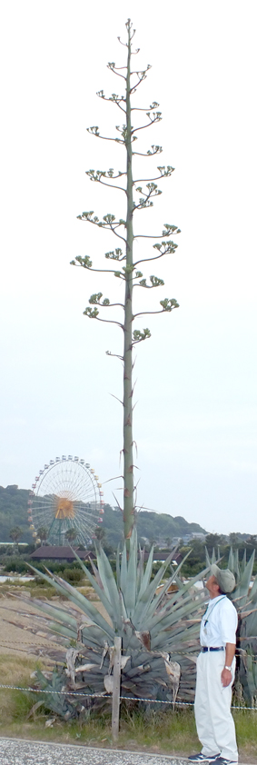 メキシコ原産でテキーラの原料として知られるアオノリュウゼツラン。花を咲かせることは稀で、咲いた株は枯死するという。同公園では「太陽のプロムナード」と公園西寄りの赤穂砂丘に計約30株が植わっている。