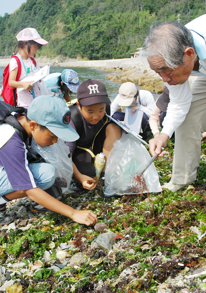 元小学校長の室井敏之さんと上野猛夫さんの案内で同海岸から伊和都比売神社まで遊歩道約1キロを歩き、シャリンバイやハマボッスなど海に面した草花や樹木を観察。ライオン岩付近で海草を採取した。