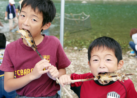 自分で捕まえたアユを炭火焼きにして食した体験教室