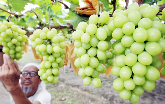 収穫はお盆の時期に始まり、現在は大粒で糖度の高い「藤稔」、皮ごと食べられる爽やかな甘さの「シャインマスカット」が旬。9月からは果汁たっぷりの「ベリーA」も出荷する。