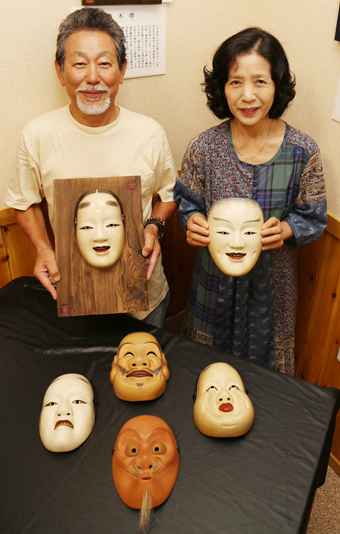 丹精込めて打ち上げた能面を出品している廣畑富美子さん(右)と大矢根文一さん
