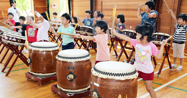 情操教育に太鼓演奏を取り入れている同幼稚園は2年前から合同運動会で竹太鼓演奏を披露している。今年度は例年よりも園児数が多いため、小学校の和太鼓を借りて演奏することになった。