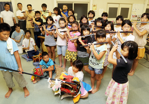 また、子どもたちの頑張りを知った上仮屋北の奥野勇雄さん(73)が漆調に塗装した手作りの竹笛13本をこのほど寄贈。それまでビニールパイプを加工した横笛を使っていた子どもたちにとって「持ったときの感触が良くて、吹きやすい」と、うれしいプレゼントになった。