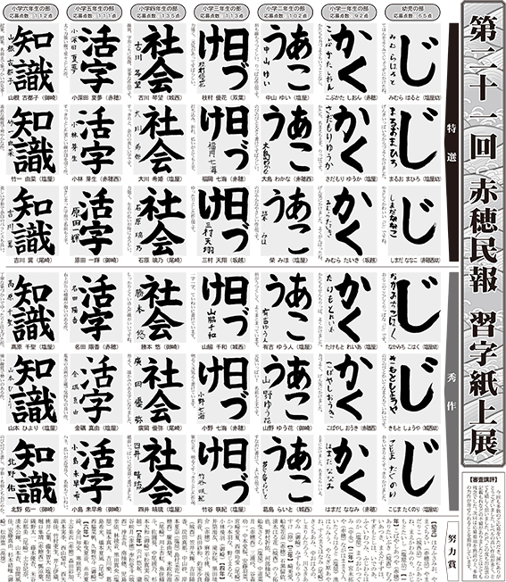 ▽努力賞=井筒 海友、滝谷 桜、黒田 竣介(赤穂)麻若 小桃、後藤 莉音、長田 紗和、釣家 沙良(城西)笠井 大輝、吉田 陽香、炭田 真那、中山 絆、岸本 夏奈(塩屋)島村 采花(赤穂西)廣島 由梨、末政 拓海(尾崎)川上 杏虹、魚住 脩斗、佐圓 葵、中尾 綾乃、杉本 大和(御崎)平松 真実(坂越)