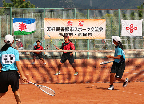 ソフトテニス競技による交流は今回が初めて。西尾市からは吉良中など8校、赤穂市からは全5校で、両市とも男女各9ペアが参加した。男女別の変則リーグ戦で全力プレーを繰り広げた。試合後は互いに記念品を交換し、西尾市からは上野介ゆかりの「赤馬」にちなんだキーホルダーが贈られた。