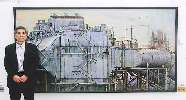 受賞作のタイトルは「三つの力(太陽・風・火力発電)」。火力発電所プラントをモチーフに自身の作品では過去最大の250号(縦約1・6メートル、横3・0メートル)に仕上げた。建屋壁面に描き入れた「11」の数字は原発問題を引き起こした東日本大震災を暗示し、画面に小さく描いた風力発電プロペラと太陽光パネルが自然エネルギーの可能性を問い掛けているかのように感じる。
