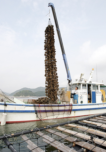市漁協によると、今シーズンは坂越沖で15業者、福浦沖で2業者が操業。広島、岡山から仕入れた種カキを合計165台の養殖いかだ(縦9メートル、横25メートル)にロープで吊している。