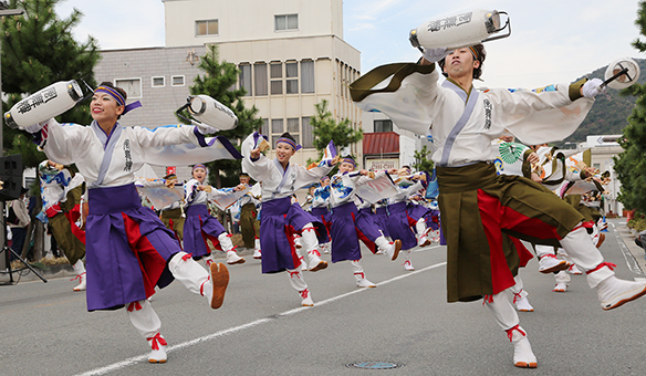 より広大なスペースを求め、昨年までの赤穂城跡花見広場から会場を移転。公園北ゲート近くの「赤穂広場」に特設ステージを組み、新潟、広島、愛媛など県外からも集まったチームが鳴子や扇子などを手に創作踊りを繰り広げた。加里屋の駅前通り、お城通りでもステージとパレードがあり、街中に活気のある楽曲と掛け声が響いた。