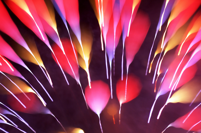 細い光の筋に赤や黄の火花が楕円に写った情景は、まるで大量の風船が空に上がっていくようにも見えて幻想的だ。