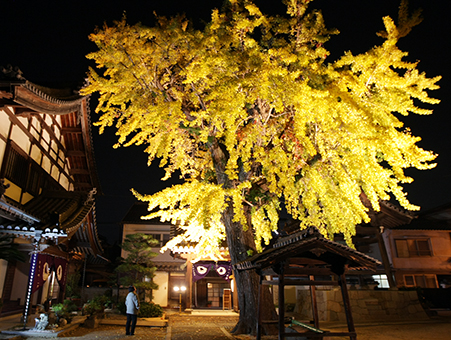 ライトアップで荘厳な姿を浮かび上がらせた浄念寺の大イチョウ