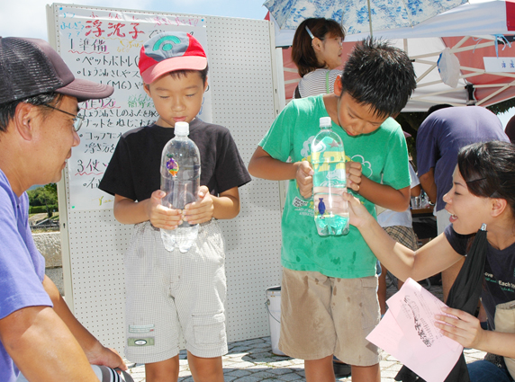 家族で来場した小学2年生の笠井美咲ちゃん(7)=塩屋=は「何でこうなるのか不思議」と何度も浮き沈みさせて遊んでいた。