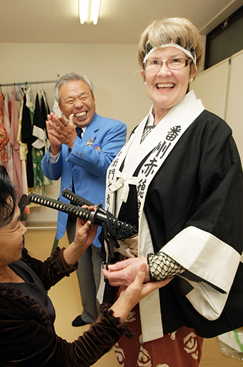 義士装束の着付けサービスに笑顔のヘレン・ダルグレイシュさん