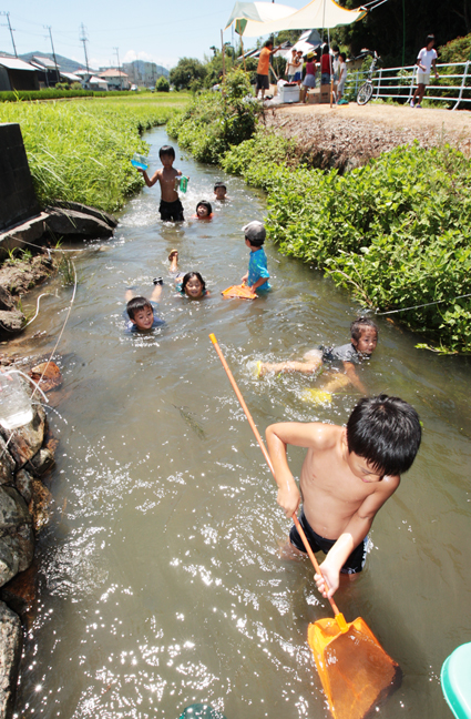 加里屋の太井秀行さん(36)の長男で小学3年生の清崇君(8)は「川で魚を捕まえてみたい」と弟皓基君(6)と一緒に水着で川へ。ペットボトルで作ったわなに小魚を見つけ、「持って帰って図鑑で調べる」と喜んでいた。
