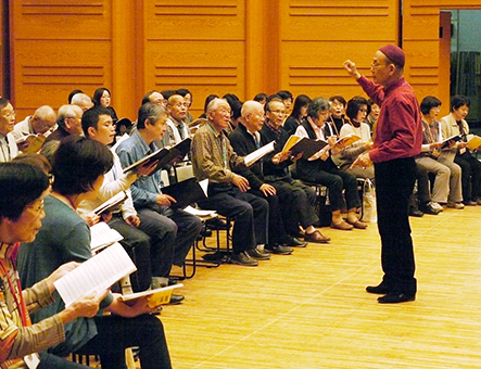 テレマン室内オーケストラの延原武春氏の指導を受ける「ハーモニー第九合唱団」=(公財)赤穂市文化とみどり財団提供