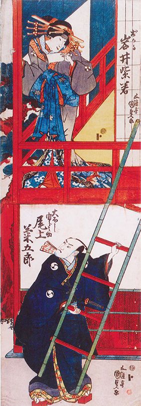 初代歌川国貞(三代豊国、1786−1864)は役者絵の第一人者だった初代豊国に15歳で入門。抜きん出た実力で師匠の名跡を継ぎ、79歳で亡くなるまで常に第一線で活躍した。幕末に江戸三座(中村、市村、森田)で上演された忠臣蔵芝居で国貞が手掛けていないものはないと言っても過言ではないほどで、「国貞作品をたどれば、幕末の忠臣蔵芝居の様相を知ることができる」(同館)という。