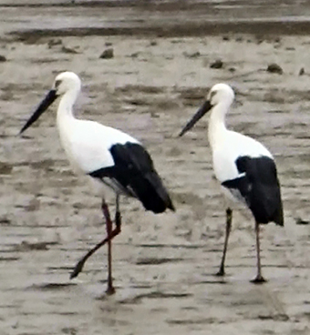 西有年の馬路池に飛来したコウノトリの姉弟=久保昭臣さん撮影