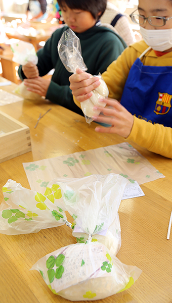 交流先の小学校へ贈る丸もちを袋詰めする高雄小5年生児童