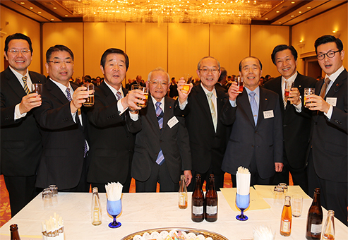 今期限りでの退任を表明している豆田正明市長は「これまでの力強いご支援とご協力に心より厚く御礼を申しあげたい」と感謝を述べ、「新市長を中心に日本一魅力のあるまちの実現を目指して取り組んでほしい」とあいさつ。商議所の前田哲児会頭が「日本経済成長のためには企業の競争力、利益、雇用、賃金を上げることが必要。昨年以上に地域活性化に頑張る」と抱負を語り、乾杯の音頭を取った。