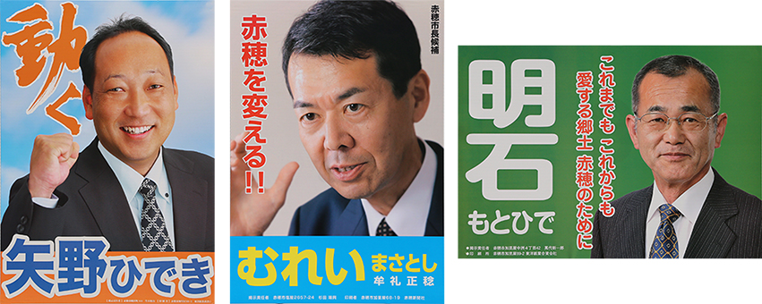 立候補者は届け出順に、▽矢野英樹氏(44)=元防水工事会社経営、加里屋中洲▽牟礼正稔氏(60)=元兵庫県職員、坂越▽明石元秀氏(64)=元赤穂市副市長、加里屋。3氏とも告示日以降、選挙カーで市内を巡回して名前を売り込み、街頭と個人演説会で理念や政策の浸透に努めてきた。