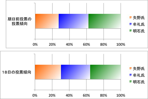 矢野氏は市総合福祉会館、城西公民館で優勢。40代以下の世代で4〜5割が支持し、支持政党別では維新支持層の約4割から票を得ている。