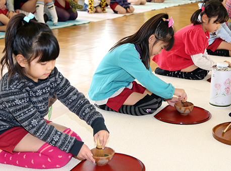 年長組の親子約70組が参加。2学期の親子陶芸体験で作った備前焼の茶碗で抹茶を点てた。園児たちはボランティア講師から教わった作法を思い出しながら正座で茶せんを動かし、「結構なお点前でした」「おいしかったです」などの感想に微笑んだ。
