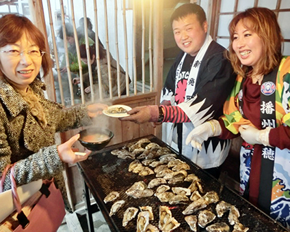 同館での赤穂産カキの振る舞いはオープン記念で行った昨年に続き2度目。鎌島水産と功結水産が50キロずつ用意して炭火焼き。奥藤商事が提供した赤穂の地酒「忠臣蔵」とセットですすめた。現地では夏場の岩ガキが主流で、瀬戸内の冬の幸を味わおうと大勢の人が列を作った。