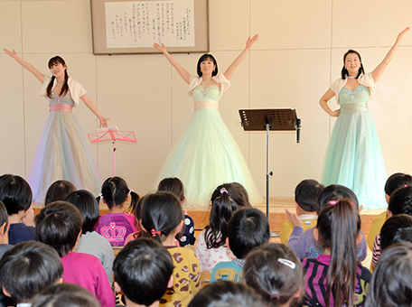 武庫川女子大音楽学部を卒業してソプラノ歌手になった年長組保護者の川崎弘枝さん=元塩町=が大学時代の同期で現役オペラ歌手の3人と来園。華やかなドレス姿で「となりのトトロ」や「小さな世界」など10曲をピアノ伴奏で歌い上げた。
