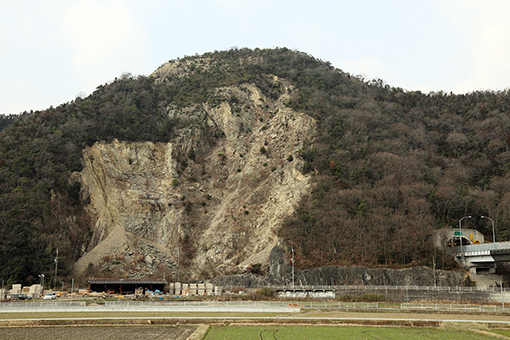 地裁判決で、落石が市道に達する危険は予見できなかったとされた目坂の崩落現場。右端に見えるのが山陽道トンネル