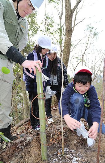 会員8人が中腹の登山道沿いに約4メートル間隔で掘った穴に若木を置き、根元に腐葉土と真砂土を混ぜた土をかぶせて竹の支柱に結びつけた。児童たちは袋に小分けした化成肥料を散布してペットボトルで水やり。自分の名前と日付を書いた記念プレートを取り付けた。