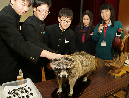 会場にはアライグマを捕獲するためのわなと駆除された個体の標本も展示した。生徒たちは剥製に触れ、「もう二度と第2、第3のアライグマをつくってはだめ。外来種も命ある生き物であることを忘れないで」と訴える羽馬さんの話に耳を傾けていた。