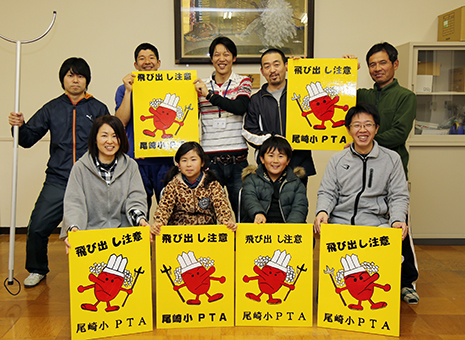 縦60センチ、横45センチで遠くからでも目につく黄色地に黒字で「飛び出し注意」。地元の祭りに登場する鼻高をモチーフに同校1年の長谷川煌(こう)君(7)がデザインしたキャラクター「おさてん」を中央に描き、6枚を作った。