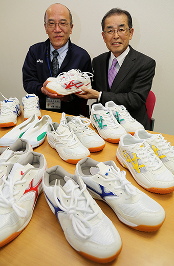 「新しいシューズで元気に駆け回って」と吉栖一弘社長(67)=千鳥=が児童寮の利用者40人に一人2足ずつプレゼント。相生産高校時代の同級生で、現在は「教育シューズ振興会」の理事長を務める茶廣幸さん=平成町=が協力した。