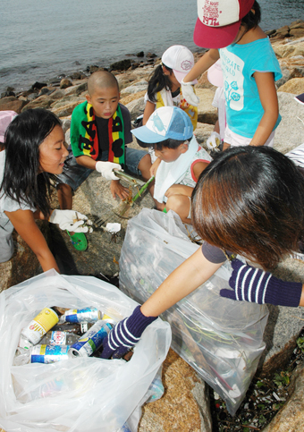 参加者は額に汗しながら空き缶や発泡スチロールなどを丁寧に一つひとつ拾った。
