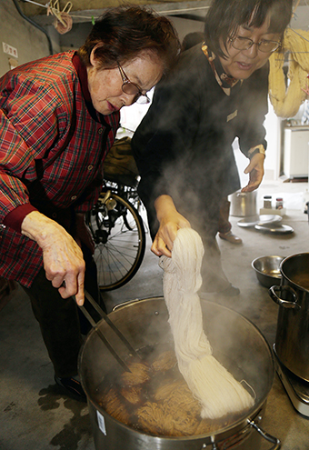 根来さんは、知人の岩本好司さん(66)が手作りした機械で20本ずつ合糸して一束200グラムと100グラムの「綛」にまとめた。草木染めに詳しい元就実短大教授の染色研究家、小田中久良子さん(81)=朝日町=の監修で5日から糸染めを開始。初日には栗の渋皮、ヤシャブシの実、マリーゴールドの花びらを原料に茶色、ねずみ色、橙色の3種類に染色した。