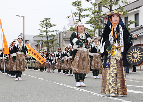 名物の「女人義士行列」は、鹿児島や京都など各地から公募で集まった8〜61歳がサクラやモモなど造花の髪飾りを付けて出演。華やかに祭りを彩った。先頭の大石内蔵助役が叩く陣太鼓の音に合わせて一歩ずつ踏みしめて歩き、最後は「エイエイオー!」の勝どきで勇壮に締めくくった。