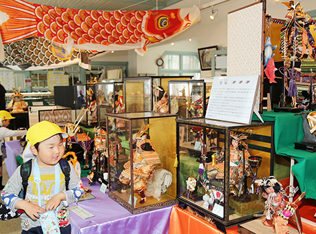 市民から集まった寄贈品のうち、端午の節句にちなんだものを展示。金色に輝くかぶとや鎧飾りには太刀や陣太鼓、軍扇なども添えられて豪華。2匹の和紙製こいのぼりは布製が出回る前の昭和初期以前に作られたとみられ、現存するのは貴重だという。
