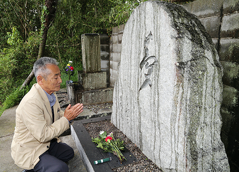 「夢」と彫字された顕彰碑に手を合わせる辰巳柳太郎の長男・新倉寿夫さん。顕彰碑は辰巳が愛した坂越の海を臨む高台にある