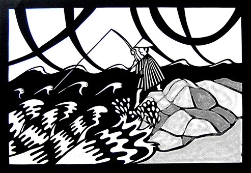 それから誰言うとなく、綱崎の浜を「恋ヶ浜」と呼ぶようになりました。(赤穂市教育委員会刊『赤穂の昔話 第一集』・「恋ヶ浜」より)=切り絵・村杉創夢