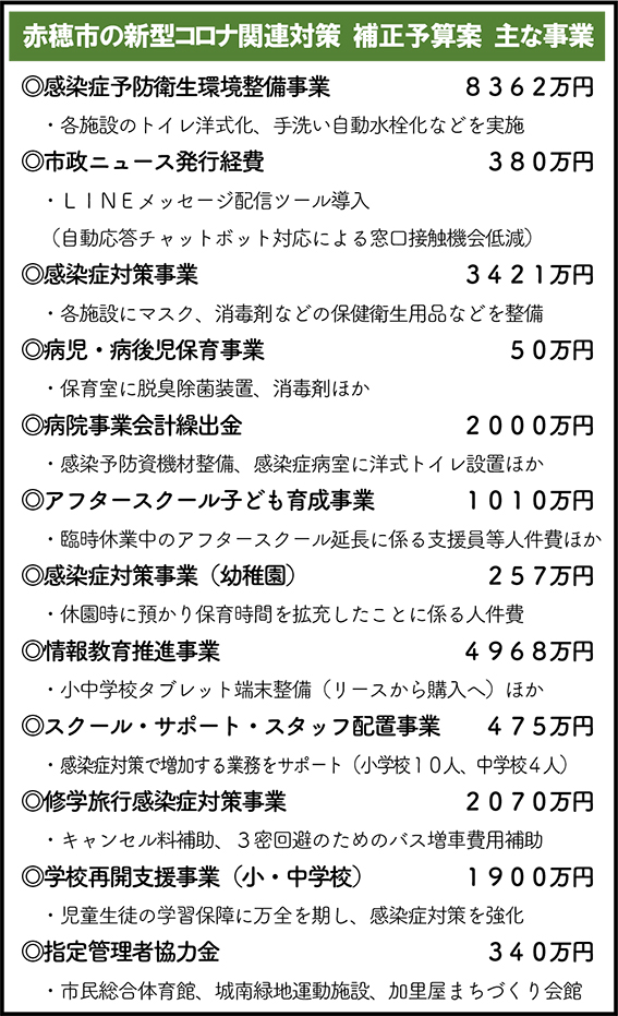 赤穂市は新型コロナウイルス対策関連経費を含む今年度一般会計補正予算案を9月4日に開会する第3回定例会に上程する。