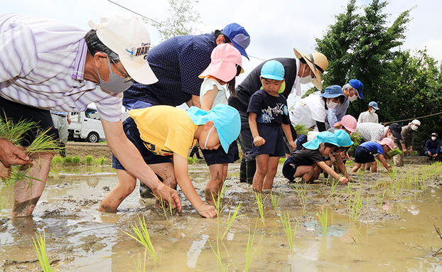 お田植え祭は、秋祭りで頭人を務める子どもが神米になる苗を手植えする慣わしで、例年地元の同世代の子どもたちが一緒に参加している。昨年はコロナ禍で大人のみだったため、2年ぶりに子どもたちが加わった。