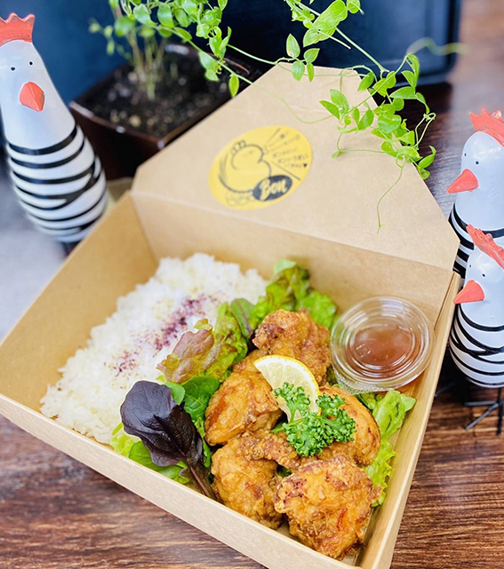 品評会で入賞するなど評価の高い九州産ハーブ鶏を使用。「からあげ弁当Box」850円、「とりレモン漬け弁当Box」860円、「丸ごとチキン揚げ」720円などのメニューがある。