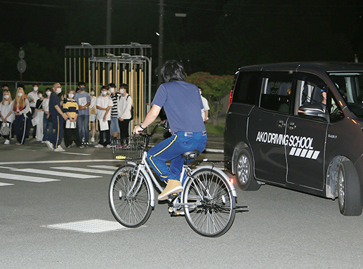 生徒に交通安全意識を高めてもらおうと、赤穂警察署と合同で開催。自転車安全教育インストラクターの資格を持つ山本裕二検査員(47)から基本的な交通ルールを学び、信号機のある交差点を自転車で安全に通行するための注意点をグループで話し合った。