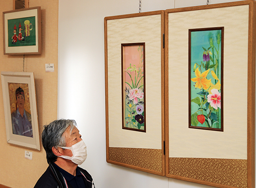 「2021赤穂市美術展」の日本画の部で市長賞を受賞した和気町の城谷允子(のぶこ)さん(79)の作品展が坂越のギャラリー喫茶「高瀬舟」で開かれている。
