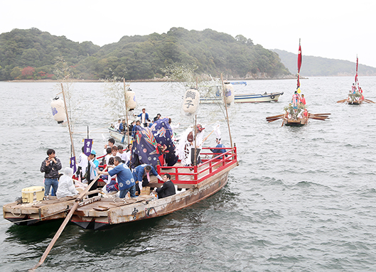 御旅所がある生島へ向かって巡航する船団。4年ぶりに獅子舞も繰り出した