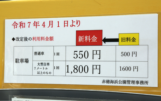 兵庫県は1日、県立施設の使用料を一斉改定。御崎の赤穂海浜公園の駐車場料金を普通車1回550円(大型車1800円)に値上げした。