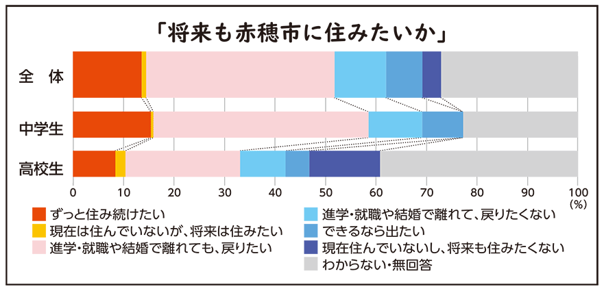「進学・就職や結婚などで赤穂市を離れると思うし、そのまま戻りたくない」(10・2%)「これからも赤穂市に住み続けることになると思うが、できるなら市から出たい」(7・2%)「現在も住んでいないし、将来も住みたくない」(3・7%)といった否定的な回答の合計は21・1%となった。また、およそ4人に1人の26・9%が「わからない」と答えた。